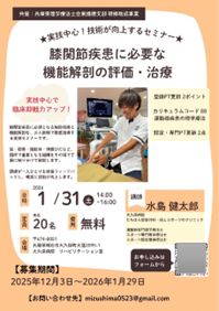 1月31日、大久保病院において、兵庫県理学療法士会の理学療法士を対象とした講習会を開催しました。「膝関節疾患に必要な機能解剖の評価・治療」をテーマとし、講義と実技を行いました。エコーで確認しながら触診と治療をすることで、手の感覚を養っていくことができます。この繰り返しでスキルは磨くことができます。20人限定の少人数制でしたが、参加者には満足したとの感想を多数いただきました。